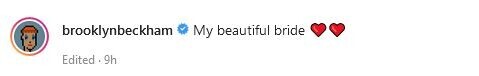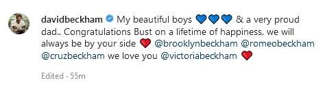 Bruklina tēvs Deivids sava vecākā dēla kāzu dienā bija īpaši emocionāls, rakstot: “Mani skaistie zēni, ļoti lepns tētis.. Apsveicam Bustu [mīļvārdiņš, kā ģimenē uzrunā Bruklinu – Aut.] ar dzīvi, kas piepildīta ar laimi, mēs vienmēr būsim līdzās.”