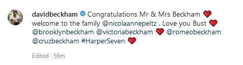 Sveicot Nikolu savā ģimenē, viņš piebilst: “Apsveicam Bekhema kungu un kundzi. Laipni lūgta ģimenē @nicolaannepeltz. Mīlam tevi, Bust.”