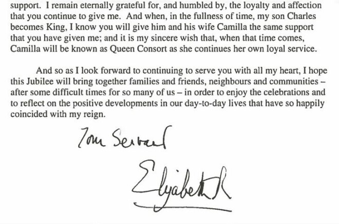 “Un, kad laika gaitā mans dēls Čārlzs kļūs par karali, es zinu, ka jūs viņam un viņa sievai Kamillai sniegsiet tādu pašu atbalstu, kādu esat snieguši man; un es patiesi vēlos, lai tad, kad pienāks šis laiks, Kamilla būtu pazīstama kā karaliene konsorte, jo viņa turpinās savu lojālo kalpošanu,” teikts karalienes Elizabetes II oficiālajā paziņojumā.