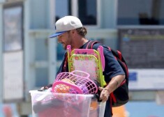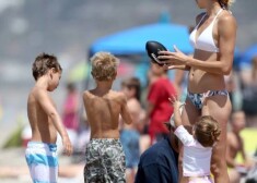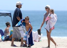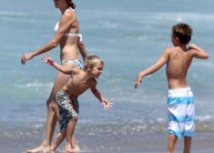 Kevins Federlains ar dzīvesbiedri Viktoriju, meitu un Britnijas bērniem pludmalē