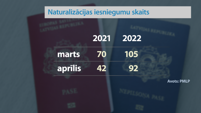 Pēdējā gada laikā naturalizēties gribētāju skaits nepilsoņu vidū Latvijā ir pieaudzis turpat vai uz pusi, liecina Pilsonības un migrācijas lietu pārvaldes (PMLP) apkopotie dati. Pārvalde kā vienu no būtiskiem iemesliem naturalizēties min Krievijas karadarbību Ukrainā. Madara Puķe, PMLP pārstāve: “Mēs jūtam lielāku interesi. Cilvēki mums raksta e-pastus, zvana, interesējas par procesu.”