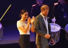 Megana Mārkla sporta pasākuma apmeklējumam izvēlējusies ikdienišķu tērpu – džinsa kreklu un ļoti īsus džinsa auduma šortus, kas atsedza viņas kājas un akcentēja šobrīd vēl ne būt ne ideālo vidukli.