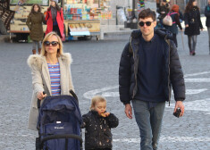 Aktieris Vils Smits ar sievu Džadu Pinketu Smitu un meitu Vilovu pludmalē.