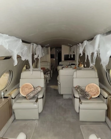 Lidmašīna bija izrotāta tā, lai atbilstu svinību brīvdabas tematikai. Tajā bija daudz spilvenu, kas pēc dizaina atgādināja koka baļķus, bet no griestiem nokarājās mākslīgi zirnekļu tīkli. Savukārt pie iekāpšanas lidmašīnā mazo gaviļnieci un viņas viesus sagaidīja baloni un uzraksts “Nortas nometne”.