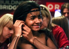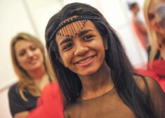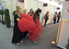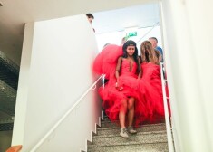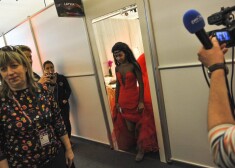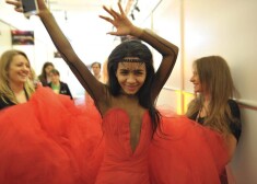 2015. gada Eirovīzijas dziesmu konkursa dalībniece no Latvijas Aminata Savadogo izmēģina skatuves tērpu un sniedz pirmās intervijas. Foto: Andres Putting ...