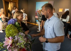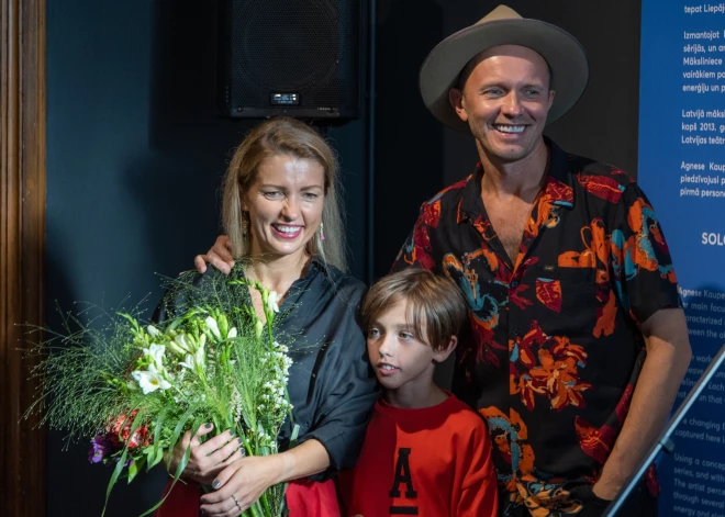 FOTO: Renārs Kaupers sveic sievu Agnesi viņas izstādes "Ķenguru neredzēju" atklāšanā