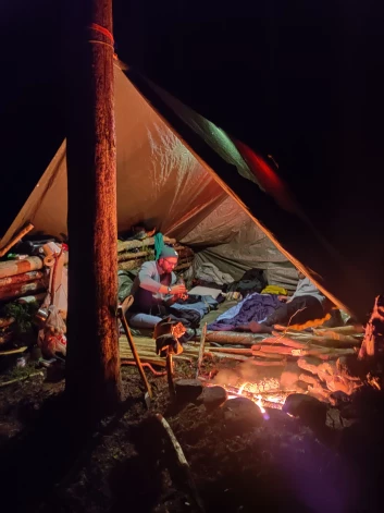 Mugursomās tiekot krāmēts līdzi tik, cik iespējams panest. Galvenokārt – nazis, cirvis, zāģis, lāpsta, striķis, plēve, lukturītis, matracis gulēšanai un, jā, arī pārtika. Ēdienkarti neregulējot, obligāta prasība pārtikt tikai no mežā atrodamām veltēm, tāpēc, liekot kopā katra līdzpaņemto, reizēm sanākot pat astoņas zortes siera. “Apstākļi brīžiem var būt tik neprognozējami, ka var noderēt viss, ko spēj aiznest.” Ejot kompānijā un saprotot, kas paņemts līdzi, jau uz vietas, mežā, tiek izlemts, kur un kā nakšņot. “Vispirms uztaisām apmetni, lai lietus un zari nekrīt uz galvas. Parasti pamatā ir rāmis, ko apliekam visriņķī vai nu ar egļu zariem, vai plēvi. Esam arī zemnīcu taisījuši, kad ierokas dziļi bedrē, – tas ziemā ir labs variants. Visu nosiltini, tam izmantojot arī foliju, uztaisi iekšā kamīniņu, sēdi vai guli bedrē, bet, kad šis nodrošināts, līdz krēslai jāsagādā malka. Ne vienmēr ejam ar guļammaisiem vai piepūšamajiem matračiem, ir gadījies arī gulēt uz skuju matracīša,” atklāj Marģers. Mūsdienās, kad vairāki “izdzīvošanas influenceri” par tādiem kļuvuši, lai reklamētu modernu un dārgu dabā gājēja ekipējumu, Marģers uz ekstrām neiespringst. Protams, ir ļoti svarīgi, lai zābaki visādā ziņā būtu ērti, taču citādi lielāku nozīmi piešķir pašam piedzīvojumam, ne lai izrādītos.