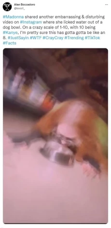 “Madonna Instagramā publiskoja kārtējo apkaunojošo un pretīgo video, kurā lok ūdeni no suņa bļodas,” viens fans pažēlojies “Twitter” blogā. “Skalā no 1 līdz 10, kur Kanje ir numur 10, esmu diezgan drošs, ka viņa būtu vismaz nr. 8.”