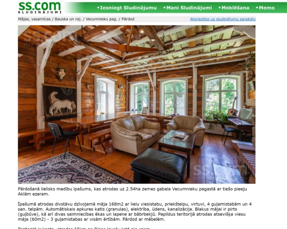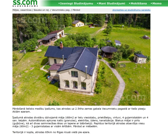 Sludinājumā norādīts, ka īpašums atrodas uz 2,54 hektāru zemes gabala ar tiešo pieeju Aklajam ezeram Vecumnieku pagastā. Īpašumā ir 168 kvadrātmetrus plaša divstāvu dzīvojamā māja ar lielu viesistabu, priekštelpu, virtuvi, četrām guļamistabām un četrām sanitārajām telpām. Automātiskais apkures katls (granulas), elektrība, ūdens, kanalizācija. Blakus mājai ir pirts (guļbūve), kā arī divas saimniecības ēkas un lapene ar barbekjū. Papildus teritorijā atrodas atsevišķa viesu māja (60 kvadrātmetru) – tajā ir trīs guļamistabas ar visām ērtībām. Pārdod ar mēbelēm. Teritorija ir kopta, atrodas 65 kilometru no Rīgas – klusā vietā pie ezera. Īpašums šobrīd pieder uzņēmējam Ērikam Šmukstam un Stepanam Ostapčukam.
