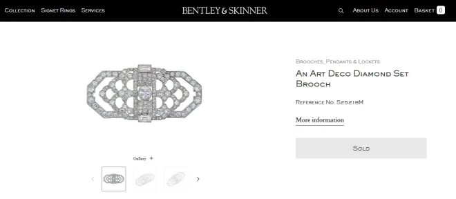 Saskaņā ar kompānijas “Bentley & Skinner” mājaslapā atrodamo informāciju, kopējais juvelierizstrādājuma izgatavošanā izmantoto briljantu svars sasniedz 4,5 karātus. Piespraude izgatavota divdesmitā gadsimta divdesmitajos gados un “atspoguļo džeza laikmeta glamūru un eleganci”.