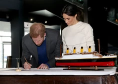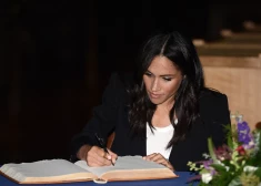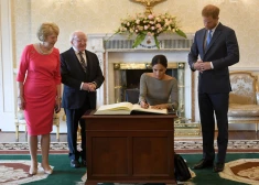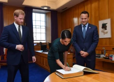 Princis Harijs un Megana Mārkla parakstās viesu grāmatās