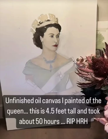 Līdzās fotogrāfijai viņš pierakstījis: “Nepabeigts eļļas audekls, kur es gleznoju karalieni. Tas ir 4,5 pēdas (137 centimetri) augsts un aizņēma aptuveni 50 stundas... Dusiet mierā, Viņas Majestāte.”