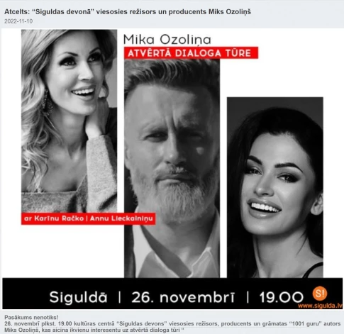 Tāpat pērn novembrī bija paredzēta Mika Ozoliņa “atvērtā dialoga tūre "Mans lielākais guru"”. Tur bija paredzēti pat “komēdijskeči, ko papildinās Mika stāsti”. Bija arī plānots, ka uz skatuves kopā ar Miku kāps pašmāju bestselleru autore Karīna Račko un psihoterapeite Anna Lieckalniņa. “"Atvērtā dialoga tūre "Mans lielākais guru"" Latvijā viesosies tikai trīs pilsētās – Liepājā, Rīgā un Siguldā,” tā bija rakstīts pasākuma pieteikumā. Taču nekādas viesošanās nebija - pasākumi tika atcelti.