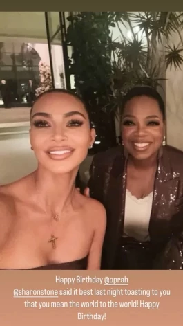 Kima Kardašjana pie apgrieztā selfija novēlēja Oprai daudz laimes dzimšanas dienā un izteicās, ka tosts par populāro TV dīvu nozīmējot nenovērtējami daudz.