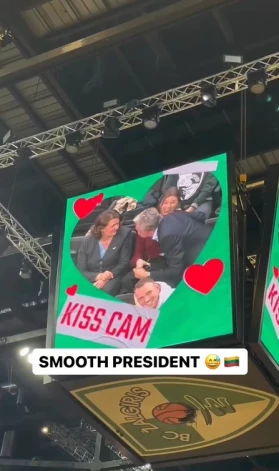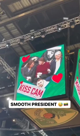 Basketbola spēles laikā kādā no minūtes pārtraukumiem, kad kubā virs laukuma tiek rādīti arēnas apmeklētāji un tie, uz kuriem ir vērsta videokamera, tiek mudināti skūpstīties, Lietuvas pirmais pāris nonāca uzmanības centrā.