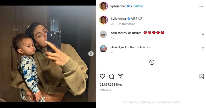 2023. gada janvārī Kailija vietnē “Instagram” dalījās ar sava dēla retu fotogrāfiju kolekciju, kur viņa bija apkopojusi līdz šim neredzētas fotogrāfijas kopš jaunākā bērna dzimšanas. Kailija šo foto sēriju nodeva publiskai apskatei līdz ar paziņojumu par puisēna vārda maiņu.