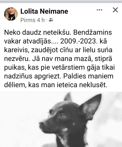 Traģisks notikums Lolitas Neimanes dzīvē - miris viņas mīlulis Bendžamins, ko sakodis kaimiņu suns