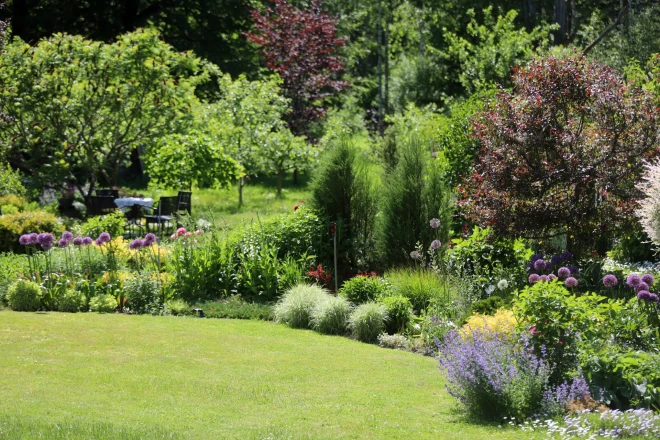 Diāna apguvusi, kā panākt dobē mainīgumu ar ziemcietēm un krūmiem. “Līdz Jāņiem zied kaķumētras jeb nepetas, ir arī sīpolpuķes un peonijas. Tās gan šopavasar diezgan daudz nosala. Kupla un krāšņa patlaban zied Diana Parks peonija. To man uzdāvināja Iveta Bērziņa no Bērziņu stādaudzētavas... Drīz nāks delfīnijas, nepetu atkārtotā ziedēšana, tad nāks hortenzijas un smilgas... Pavasarī dobē ir dažas tulpes un krokusi, bet mums ir daudz tulpju un krokusu, kas sastādīti zem ozoliem. Tiek uzskatīts, ka zem ozoliem un liepām nekādas puķes neaug, bet pavasara puķu pļavu kā paklāju gan ir iespēja izveidot! Ozoliem lapas uzplaukst vēlāk, līdz ar to gan gaismas, gan mitruma visam, kas aug apakšā, ir gana. Mums zem ozoliem ir savvaļas tulpju šķirnes, muskares, baltās vizbulītes, kas no meža nāk iekšā, zilsniedzītes, sniegpulkstenītes. Pirmajā gadā, bakstot zemē, iestādījām 500 puķu sīpolus, bet pagājušogad sanāca pavisam jautri. Mēs to darījām decembra sākumā, kad zemes virskārta jau bija sasalusi. Vīrs un dēls ar urbi taisīja caurumus, ka rūc vien, iemeta tajos sīpolus, un zemi uzbēra virsū. Kāds tūkstotis sīpolu šādi tika sastādīti. Bet viss arī sanāca, pavasarī zem ozoliem viss bija ziedos. Uz katru kvadrātmetru likām 100 sīpolu,” stāsta Diāna.