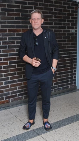 Aktieris Artūrs Skrastiņš bija tērpies ērtā brīvā laika uzvalkā, ko papildināja ar stilīgām ērtām vasaras kurpēm no zīmola "Vivobarefoot".