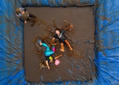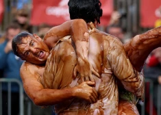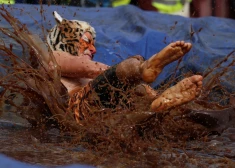 Sacensībās, kas atzītas par vienu no desmit dīvainākajiem "sporta veidiem", ar gaļas mērci piepildītā ringā cīnījās 16 vīrieši un astoņas sievietes.