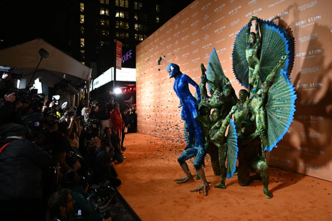 Modeli, kura pagājušā gada svinībās bija tērpusies kā rievots sarkans tārps, pavadīja desmit cilvēku svīta, kas bija tērpušies pāva astes košajās krāsas. Heidija veidoja pāva centrālo daļu, kamēr viņas komanda bija atbildīgi par pāva cēlās astes izskatu.