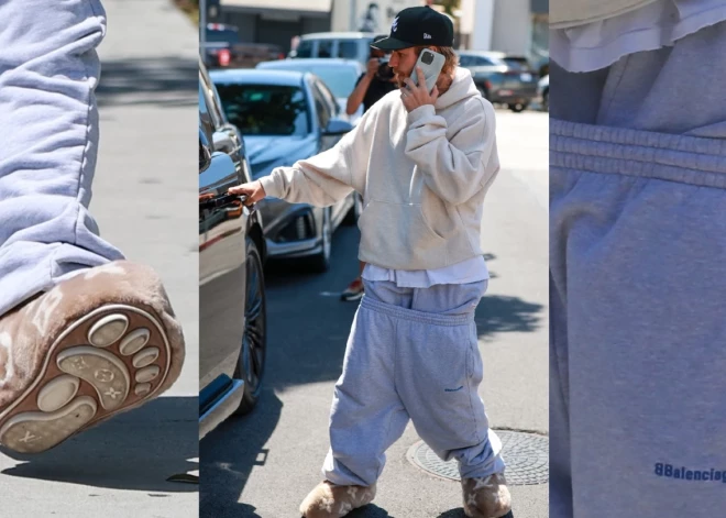 Saviem pūkainajiem apaviem 30 gadus vecais hita “Baby” izpildītājs bija pieskaņojis ne tikai vienas, bet pat divas sporta bikses. Zīmola “Balenciaga” treniņbikses (1490 ASV dolāru) viņš bija uzvilcis vienas virs otrām, virsējām atstājot pusuzvilktas tikai nedaudz virs ceļgaliem. Savu koptēlu viņš papildinājis ar bēšu sporta jaku ar kapuci un beisbola cepuri. Kādā ceļa posmā uz restorānu, viņam bija arī virsjaka ar rāvējslēdzēju. Džastina draugs bija ģērbies daudz ierastāk – brīva piegriezuma biksēs ar kabatām uz ceļgaliem, pelēkā hudijā un baltos apavos.