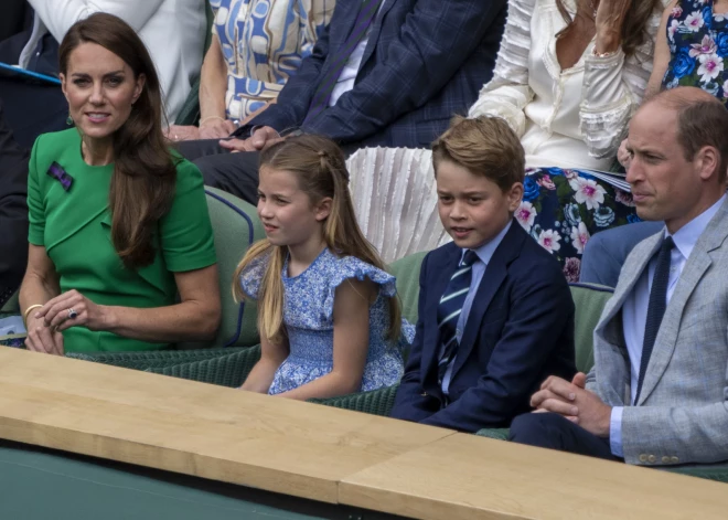 Princis Viljams un princese Ketrīna ar vecākajiem bērniem vēro Vimbldonas tenisa čempionātu 2023. gada jūlijā