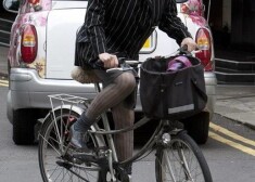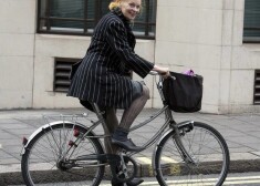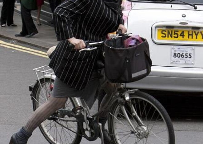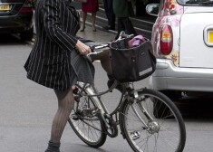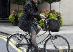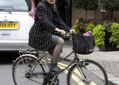 70 gadus vecā dizainere Vivjena Vestvuda uz velosipēda