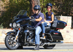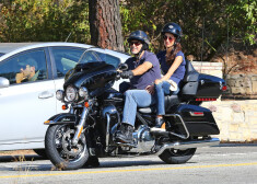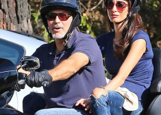 Aktieris Džordžs Klūnijs Losandželosā vizina sievu Amalu uz viena no saviem „Harley Davidson” spēkratiem.