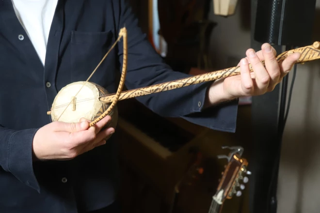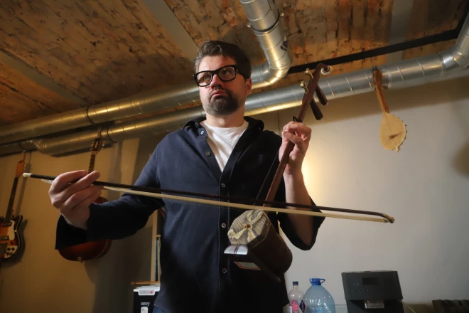 Ķīniešu divstīgu vijole erhu, kurā izmantota čūskas āda. “Šķiet, ka Latvijā šādu instrumentu vispār neviens nespēlē,” spriež Kārlis Auzāns, kas to izmantojis Dailes teātra izrādes "M. Butterfly" mūzikā.