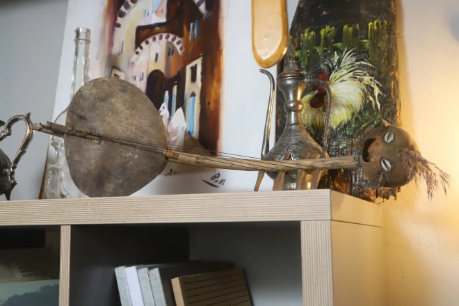 Albāņu instruments lahut. Ar vienu stīgu, ko spēlē ar lociņu. “Tieši šis mani uzrunāja ar to, ka taisīts pagājušā gadsimta septiņdesmitajos gados. Ar skaistiem kokgriezumiem un albāņu motīviem. Unikāls instruments,” uzsver Kārlis.