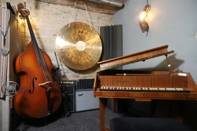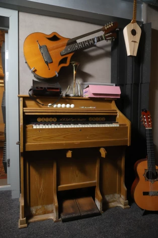Mārtiņa Ķibilda ērģeles. Mārtiņš dzīvoja Kārlim kaimiņos, pēc Mārtiņa nāves šis instruments nonāca mūziķa kolekcijā. Bet virs tām divu grifu Krievijas čigānu ģitāra no pagājušā gadsimta paša sākuma, vairāk nekā 100 gadus sena.