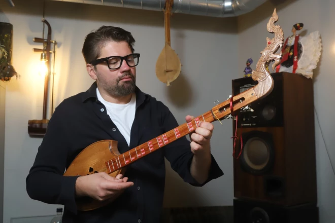 Phin no Taizemes. “Zināju, ka Bangkokā ir tirgus, kur var atrast vietējos instrumentus. Kad filmējām Ziemassvētkus džungļos, vairākas stundas klīdu pa tirgu, līdz atradu, ko gribēju. Šis instruments pēc tam daudz tika izmantots Ziemassvētku džungļos mūzikas ierakstos. Rets atradums, jo izceļas ar īpašu skaņu, un, re, kāda tam pūķa galva!” lepojas mūziķis.