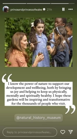 42 gadus vecā Keita Midltone, kura ir britu Nacionālā vēstures muzeja patronese, ceturtdien dalījusies ar sirsnīgu vēstījumu, lai veicinātu viņu Pilsētvides projekta uzsākšanu. Prinča Viljama sieva “Instagram” stāstos dalījusies ar fotogrāfijām no projekta apmeklējuma 2021. gadā un aicinājusi cilvēkus vairāk laika pavadīt dabā. Viņa rakstīja: “Es zinu, kā dabas spēks balsta mūsu attīstību un labklājību, gan sagādājot mums prieku, gan palīdzot uzturēt mūs fiziski, garīgi un emocionāli veselus. Ceru, ka šie dārzi būs iedvesmojoši un transformējoši tiem tūkstošiem cilvēku, kas tos apmeklēs.”