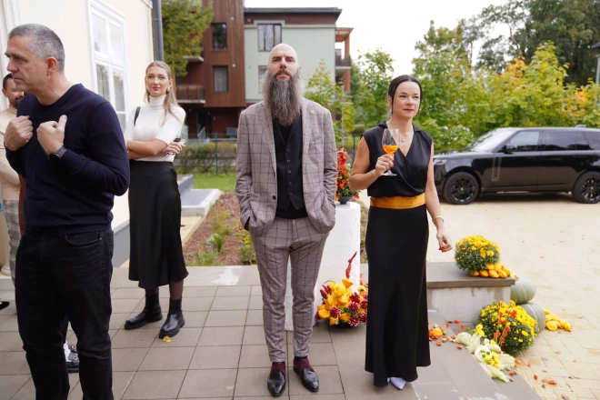 Atjaunotās Ēbelmuižas īpašnieks atklāšanas pasākumam izvēlējās rūtainu uzvalku, kam pieskaņoja nevis klasisko balto kreklu, bet gan vesti. Mākslinieciskā stilā ieturēto koptēlu lieliski papildināja arī stilīgi divkrāsaini apavi.