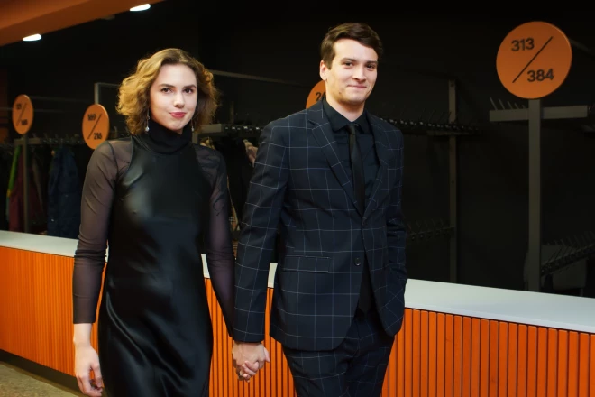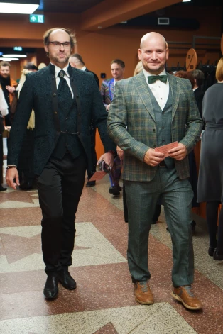 Leļļu teātra aktieris ir izvēlējies elegantu, sezonas tendencēm un pasākumam atbilstošu uzvalku. Var uzteikt arī krekla un kaklasaites izvēli. Viņa tērps arī lieliski saskan ar pavadones kleitu.