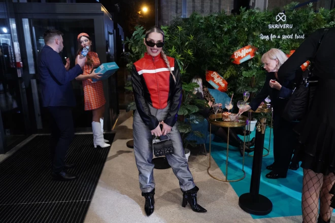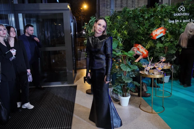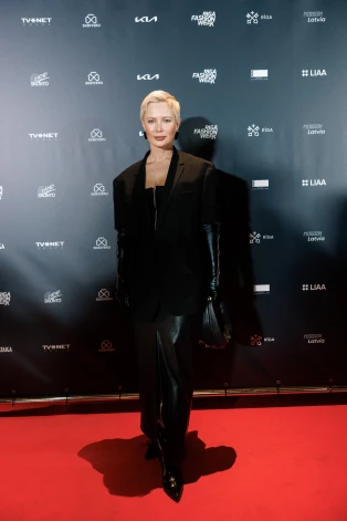Šova "Ir talants!" tiesnese apmeklēja Rīgas modes nedēļas skates krāsainā mākslīgās ādas jakā, kas atbilst aktuālajām modes tendencēm. Mazā somiņa ar kniedēm papildināja stilīgu koptēlu.