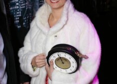 Un tieši viņa bija tā, kas starp ballītes viesiem visvairāk izcēlās – gan ar skaisto, sarkano kleitu, gan arī ar neparasto rokassomiņu pulksteņa formā.