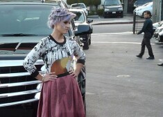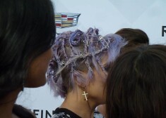 Mohikāņu frizūru TV personība bija sapinusi sīkās bizītēs un katrā no tām iespraudusi pa spraužamadatai, kā arī kreisajā frizūras pusē izveidojusi ķēdīti no vairākām kopā saspraustām drošības adatām.