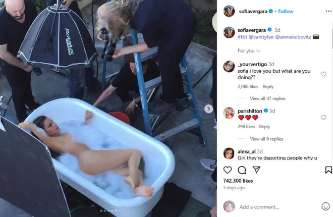 Sofija demonstrēja savu brīnišķīgo augumu jutekliskā fotogrāfiju sērijā. Vienā no tām viņa pilnībā kaila gulēja vannā – putas bija novietotas tā, lai piesegtu intīmās vietas, bet sēžamvieta koķeti atklāta. Vienu roku Kolumbijā dzimusī aktrise bija aizlikusi aiz galvas un pavedinoši skatījās fotogrāfes Annijas Leibovicas kamerā.