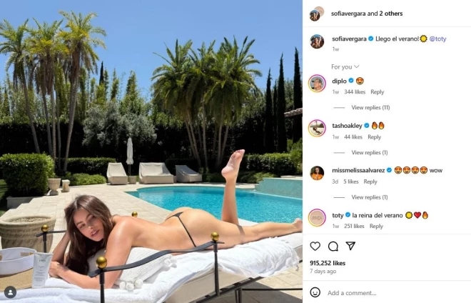 Pirms dažām dienām aktrise uzkurināja fanu interesi ar citu pikantu bildīti. Selfijā viņa parādīja, kā sauļojas pie baseina bez krūštura. Šova “America’s Got Talent” žūrijas pārstāve bija gandrīz pilnībā kaila. Viņa bija tērpusies vien pavisam miniatūrās bikini biksītēs, kas maz atstāja iztēlei. Daloties ar šo attēlu “Instagram” blogā, Sofija pievienoja komentāru spāņu valodā, kas nozīmē “Vasara ir klāt!”