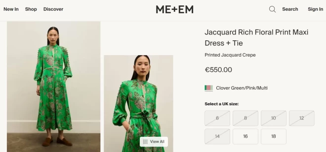Apģērbs dizainera mājaslapā raksturots kā: “Ērta un pārliecināta, šī maxi garuma kleita izceļ bagātīgu ziedu rakstu un ir darināta no viskozes krepa auduma ar teksturētu žakarda apdari, kas piešķir smalku spīdumu. Garās balonveida piedurknes ir rotātas ar apvilktām auduma pogām."