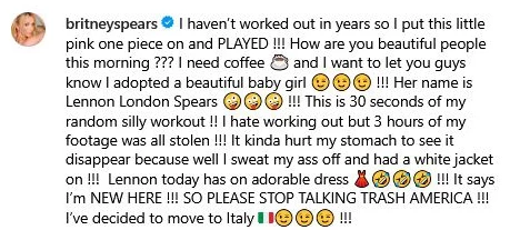 Britnija rakstīja: “Es neesmu vingrojusi gadiem ilgi, tāpēc uzvilku šo rozā tērpu un VIENKĀRŠI SPĒLĒJOS!!! Kā jums šorīt klājas, skaistie cilvēki??? Man vajag kafiju un es gribu jums pastāstīt, ka esmu adoptējusi brīnišķīgu meitenīti!!! Viņas vārds ir Lenona Londona Spīrsa!!! Šeit redzamas 30 sekundes no manas spontānās muļķīgās vingrošanas!!! Man riebjas trenēties, bet kādas 3 stundas no mana uzņemtā materiāla ir nozagtas!!! Tas gandrīz lika manam vēderam sarauties – skatīties, kā tas viss vienkārši pazūd, jo es tā svīdu un man mugurā bija balts žakete!! Šodien Lenonai mugurā ir burvīga kleitiņa !!! Uz tās rakstīts: Es esmu ŠEIT JAUNĀ!!! LŪDZU, PĀRTRAUCIET RUNĀT SLIKTI PAR AMERIKU!!! Esmu nolēmusi pārcelties uz Itāliju!!!”