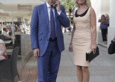 Rīgas mērs Nils Ušakovs ar savu padomnieci juridiskajos jautājumos Ivetu Strautiņu 2014. gada 17. jūlijā apmeklē Sanktpēterburgas Marijas teātra viesizrādi.