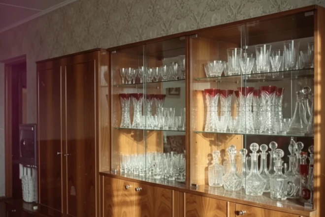 Lai izrādītu kristāla dārgumus, bija nepieciešams skapis. Šī masīvā mēbeļu konstrukcija ieņēma centrālo vietu viesistabā. Aiz stikla durvīm izstādīja ne tikai traukus, bet arī suvenīrus no ārzemēm, retas grāmatas vai pat tukšas pudeles no importētiem dzērieniem. Neskatoties uz to, ka tie aizņēma daudz vietas maza izmēra dzīvokļos, no tā iegādes neatteicās.