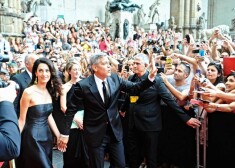 Holivudas aktieris Džordžs Klūnijs pirmo reizi paņēmis līdzi līgavu Amalu Alamuddinu uz sarkanā paklāja pasākumu.
