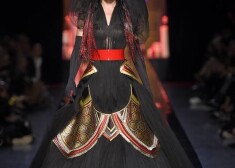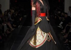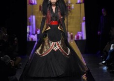 Parīzē notiekošajā augstās modes nedēļā bārdainā Končita Vursta uz mēles iznesa melnu „Jean Paul Gaultier” kāzu kleitu.