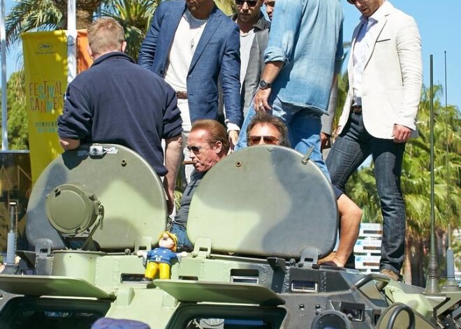 Lai reklamētu filmas „The Expendables 3” jaunāko turpinājumu, spraiga sižeta filmu zvaigznes Kannās uz fotosesiju ieradās... bruņutransportieros!