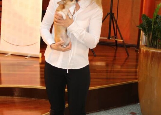 Apburošā Binnija un viņas četrkājainā mīlule Klāra „Kucēnu zobu tīrīšanas skolas” atklāšanas pasākumā 2014. gada 27. martā