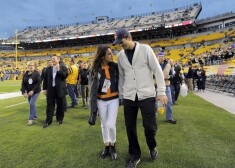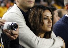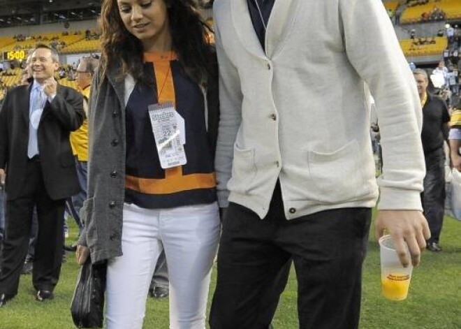 Eštons Kačers un Mila Kunisa tribīnēs vēro amerikāņu futbolu